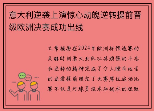 意大利逆袭上演惊心动魄逆转提前晋级欧洲决赛成功出线