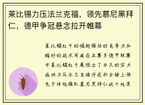 在本赛季德甲联赛中,莱比锡红牛展现出了非凡的实力,成功力压法兰克福,并在积分榜上领先于传统强队慕尼黑拜仁。这个结果无疑引起了广大球迷和媒体的高度关注,也让德甲争冠的悬念变得更加扑朔迷离。莱比锡红牛是如何在这个竞争激烈的联赛中脱颖而出的呢?