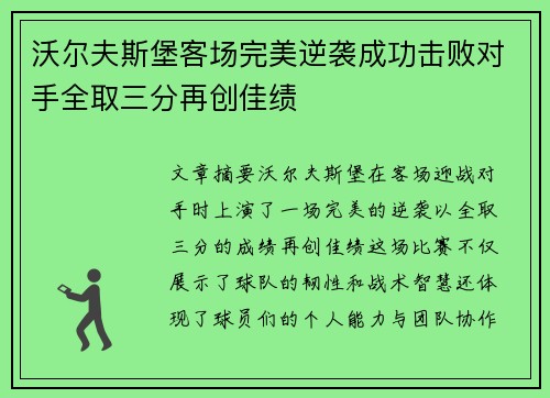 文章摘要:沃尔夫斯堡在客场迎战对手时上演了一场完美的逆袭,以全取三分的成绩再创佳绩。这场比赛不仅展示了球队的韧性和战术智慧,还体现了球员们的个人能力与团队协作精神。从比赛的前期劣势到后期的精彩反扑,沃尔夫斯堡证明了自己在困境中依旧能够稳住阵脚,最终以胜利结束比赛,成功取得宝贵的三分。这场胜利对于球队在赛季中的长远发展意义深远,也让球迷们对沃尔夫斯堡的未来充满期待。本文将从比赛的战术安排、关键球员的表现、对手的失误及沃尔夫斯堡的应对策略等四个方面进行详细分析,展示球队如何从困境中走出并逆转局面,最终获得胜利。