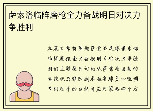 本篇文章将围绕萨索洛足球俱乐部临阵磨枪,全力备战明日对决力争胜利的主题展开讨论。从萨索洛当前的竞技状态、球队战术准备、球员心理调节到对手的分析与应对策略四个方面进行详细阐述。首先,我们将简要回顾萨索洛近期的表现及球队在比赛中的特点,然后深入分析球队如何通过战术调整和心理调节做好充分准备,力争在即将到来的比赛中赢得胜利。最后,结合当前的整体情况,我们对萨索洛的备战工作进行总结,展望他们的未来表现和挑战。通过对萨索洛的全面分析,我们不仅能够理解球队的备战策略,还能对其未来的表现和潜力有更深的认识。