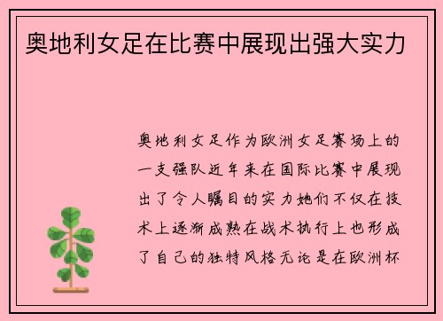 奥地利女足在国际赛场上的出色表现,充分展示了她们强大的实力和不屈的精神。通过科学的训练体系、卓越的战术执行力以及不断涌现的年轻球员,奥地利女足正逐步走向世界女足的巅峰。相信在不久的将来,奥地利女足将在更多国际赛事中取得更加辉煌的成绩,成为全球女足的代表性力量之一。