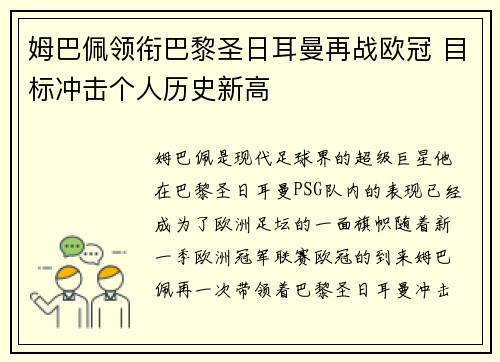 姆巴佩是现代足球界的超级巨星,他在巴黎圣日耳曼(PSG)队内的表现已经成为了欧洲足坛的一面旗帜。随着新一季欧洲冠军联赛(欧冠)的到来,姆巴佩再一次带领着巴黎圣日耳曼冲击更高的目标,争取刷新个人历史的纪录。本文将从四个方面详细分析姆巴佩在新赛季欧冠赛场上的目标与期望:首先是他的技术与个人实力,如何帮助巴黎圣日耳曼在欧冠中取得突破;其次是球队的阵容建设与配合,巴黎圣日耳曼如何为姆巴佩提供更好的支持;第三是巴黎圣日耳曼的战术调整与战略布局,如何围绕姆巴佩进行战术打造;最后是姆巴佩的心理状态与比赛心态,如何面对欧冠这样的大赛压力。通过这些方面的详细探讨,我们将进一步了解姆巴佩如何在本赛季欧冠赛场上实现个人历史新高。