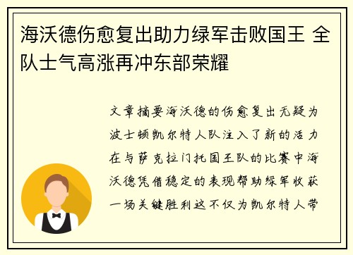 海沃德伤愈复出助力绿军击败国王 全队士气高涨再冲东部荣耀