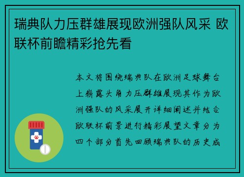 本文将围绕瑞典队在欧洲足球舞台上崭露头角,力压群雄,展现其作为欧洲强队的风采展开详细阐述,并结合欧联杯前景进行精彩展望。文章分为四个部分,首先回顾瑞典队的历史成绩与球员实力,再分析其在欧洲赛事中的竞争优势,随后探讨瑞典队目前的战术打法和未来发展潜力,最后重点预测欧联杯的精彩前景。从瑞典队的整体实力到具体比赛策略,以及未来可能面临的挑战和机遇,本篇文章将全面解析瑞典队如何在欧联杯赛场上占据一席之地,并预示该队未来将如何进一步挑战更高的欧洲足球舞台。