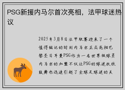 2025年3月8日,法甲联赛迎来了一个值得铭记的时刻,内马尔正式亮相巴黎圣日耳曼(PSG)。作为一名世界级球员,内马尔的加盟不仅让PSG的球迷欢欣鼓舞,也迅速引起了全球足球迷的关注。内马尔的身影出现在巴黎的球场上,标志着他在欧洲足坛的新征程正式开启,也让法甲联赛瞬间成为了所有媒体和球迷热议的焦点。