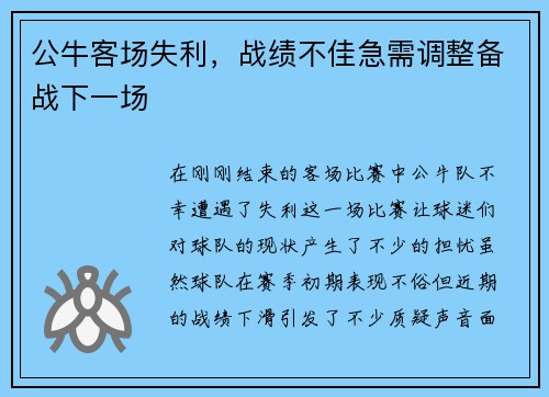 在刚刚结束的客场比赛中,公牛队不幸遭遇了失利,这一场比赛让球迷们对球队的现状产生了不少的担忧。虽然球队在赛季初期表现不俗,但近期的战绩下滑引发了不少质疑声音。面对连续的失利,公牛队似乎陷入了低谷,球迷的期待和球队的压力都在加大。如何从当前的困境中走出,调整战术、改善整体表现,成为了公牛队管理层和教练组迫切需要解决的问题。