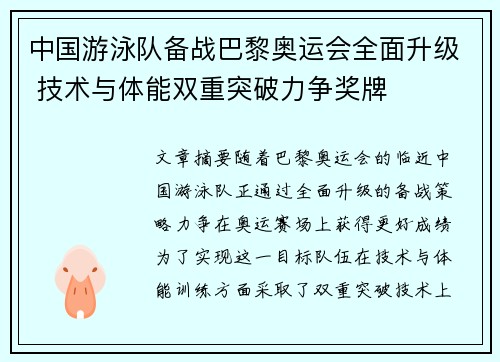 文章摘要:随着巴黎奥运会的临近,中国游泳队正通过全面升级的备战策略,力争在奥运赛场上获得更好成绩。为了实现这一目标,队伍在技术与体能训练方面采取了双重突破。技术上,游泳队加强了对世界顶级泳者的技术分析,优化了训练方法,并力求在战术上更加精准与多样化;体能方面,队员们的日常训练更加注重综合性与个性化相结合,提升耐力与爆发力。此外,队伍还特别注重心理素质的培养,通过心理辅导帮助运动员调节压力,保持最佳状态。在如此全方位的备战背景下,中国游泳队希望能够在巴黎奥运会上挑战自我、突破极限,争取更多奖牌,展现中国游泳的强大实力。