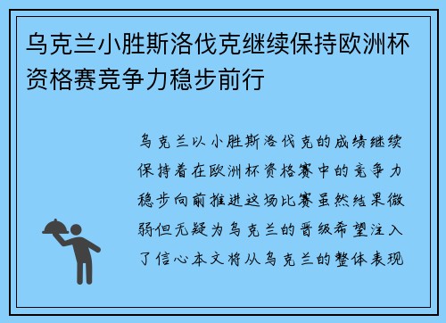 乌克兰以小胜斯洛伐克的成绩,继续保持着在欧洲杯资格赛中的竞争力,稳步向前推进。这场比赛虽然结果微弱,但无疑为乌克兰的晋级希望注入了信心。本文将从乌克兰的整体表现、战术调整、球员个人发挥以及未来展望四个方面,深入分析乌克兰如何在欧洲杯资格赛中继续稳步前行,保持强劲竞争力。通过分析这场比赛的细节,探讨其背后的深层次原因,进一步理解乌克兰足球的进步与挑战。最终,我们将总结乌克兰在这场胜利中积累的经验,并展望其在接下来的欧洲杯预选赛中的可能表现。
