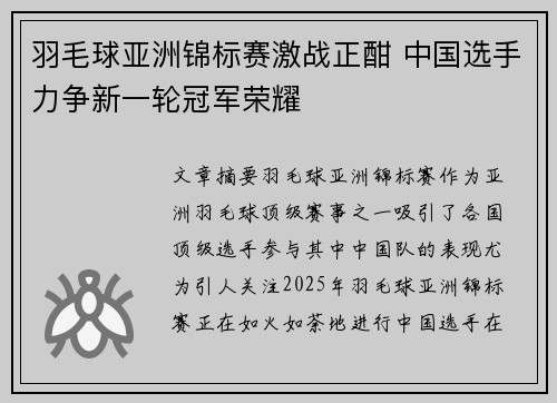 本届羽毛球亚洲锦标赛是一次充满挑战与机遇的赛事。中国羽毛球队的选手们通过长期艰苦的备战,在比赛中充分展现了自身的实力与技术水平,尤其是在男单、女单及双打项目中都有着极为出色的表现。然而,来自其他国家选手的强大挑战也提醒我们,羽毛球的竞技水平正在全球范围内逐步提高,任何一支队伍都不能掉以轻心。